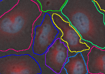 Finds local extrema using Laplacian of Gaussian filter. The local extrema are then grown to a specified intensity threshold. Resulting objects do not have holes. It is useful for round shapes with similar size like nuclei or spots where the objects are bright and background is dark.